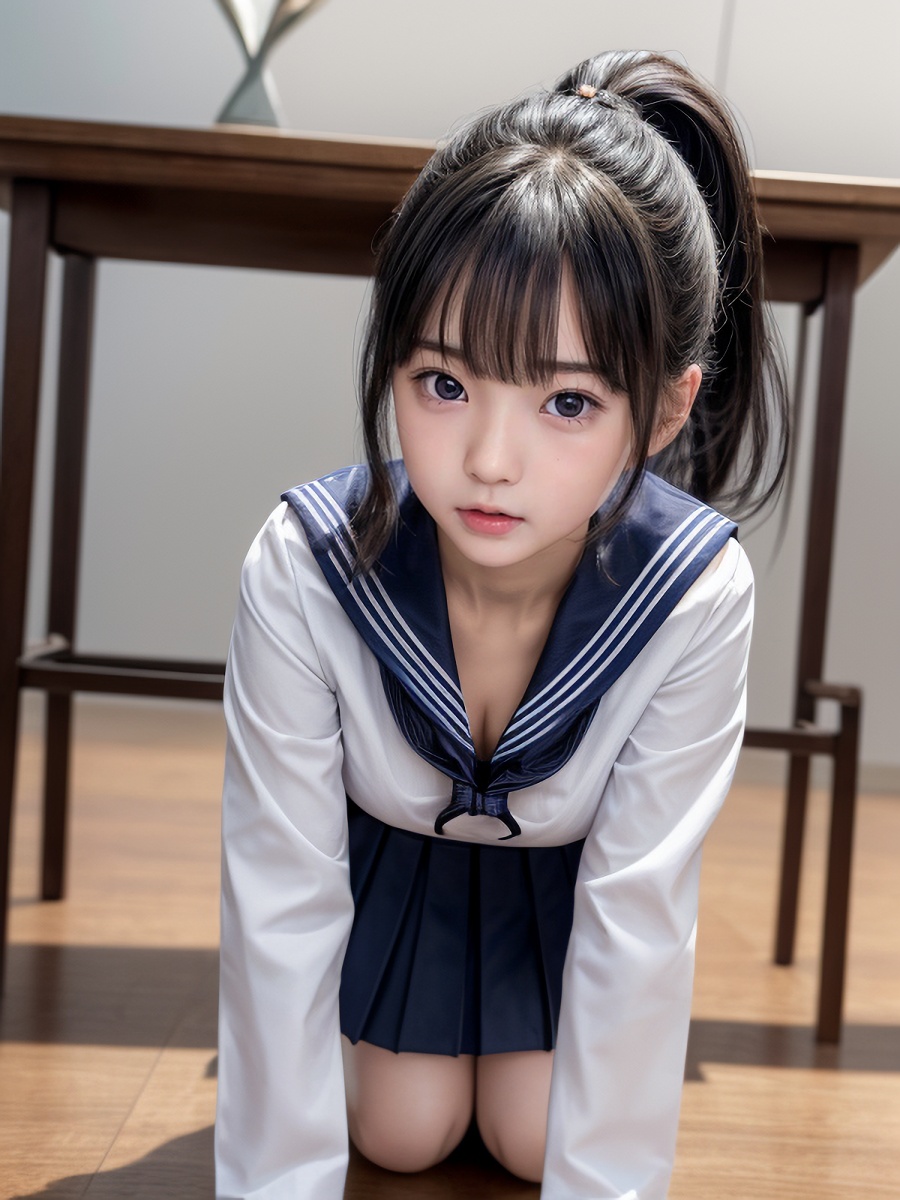 R-18 JKセーラー服を着た黒髪ポニーテールAI女子校生さんの胸の谷間や乳袋のおっぱい画像